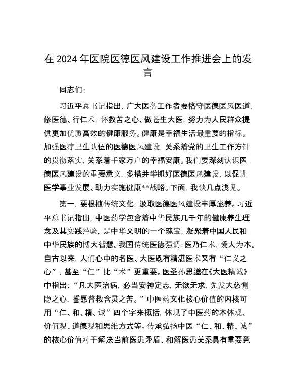 在2024年医院医德医风建设工作推进会上的发言 2024-05-23 Word模板 117 购买前,请一定要先点击这里看看,欢迎持续关注,精彩模板每天推送 预览结束,本文件为word文档,一共4页,共1593字,请购买后,下载后查看 购买前,请一定要先点击这里看看,欢迎持续关注,精彩模板每天推送 资源下载下载价格29 RMBVIP免费升级VIP点击检测网盘有效后购买有任何充值和下载问题请加微信:xuexixuexi66 0 演讲发言