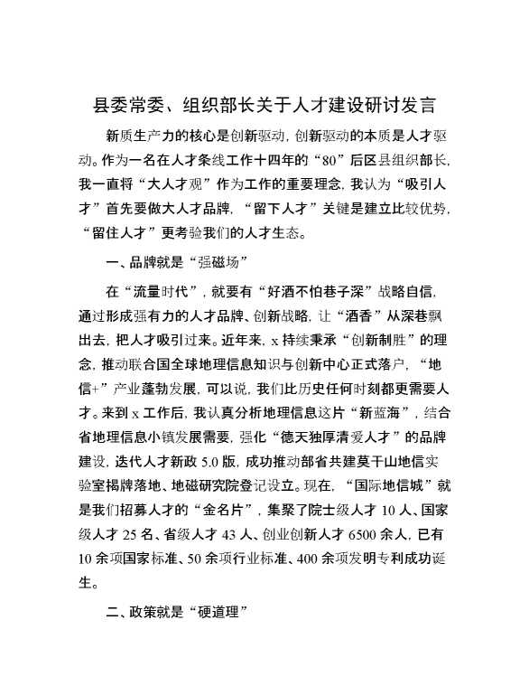 县委常委、组织部长关于人才建设研讨发言 2024-05-27 Word模板 110 购买前,请一定要先点击这里看看,欢迎持续关注,精彩模板每天推送 预览结束,本文件为word文档,一共3页,共1169字,请购买后,下载后查看 购买前,请一定要先点击这里看看,欢迎持续关注,精彩模板每天推送 资源下载下载价格29 RMBVIP免费升级VIP点击检测网盘有效后购买有任何充值和下载问题请加微信:xuexixuexi66 0 演讲发言