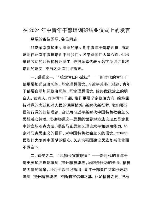 在2024年中青年干部培训班结业仪式上的发言 2024-05-27 Word模板 109 购买前,请一定要先点击这里看看,欢迎持续关注,精彩模板每天推送 预览结束,本文件为word文档,一共3页,共1360字,请购买后,下载后查看 购买前,请一定要先点击这里看看,欢迎持续关注,精彩模板每天推送 资源下载下载价格29 RMBVIP免费升级VIP点击检测网盘有效后购买有任何充值和下载问题请加微信:xuexixuexi66 0 演讲发言