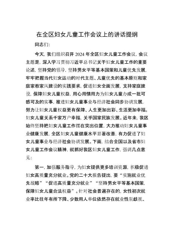 在全区妇女儿童工作会议上的讲话提纲 2024-05-27 Word模板 111 购买前,请一定要先点击这里看看,欢迎持续关注,精彩模板每天推送 预览结束,本文件为word文档,一共6页,共3067字,请购买后,下载后查看 购买前,请一定要先点击这里看看,欢迎持续关注,精彩模板每天推送 资源下载下载价格29 RMBVIP免费升级VIP立即购买有任何充值和下载问题请加微信:xuexixuexi66 0 演讲发言