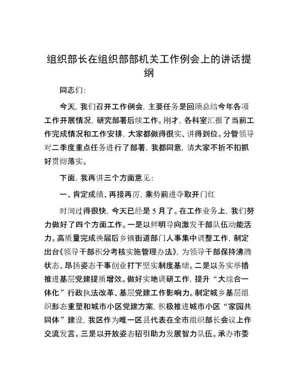 组织部长在组织部部机关工作例会上的讲话提纲 2024-05-27 Word模板 109 购买前,请一定要先点击这里看看,欢迎持续关注,精彩模板每天推送 预览结束,本文件为word文档,一共6页,共2664字,请购买后,下载后查看 购买前,请一定要先点击这里看看,欢迎持续关注,精彩模板每天推送 资源下载下载价格29 RMBVIP免费升级VIP点击检测网盘有效后购买有任何充值和下载问题请加微信:xuexixuexi66 0 演讲发言