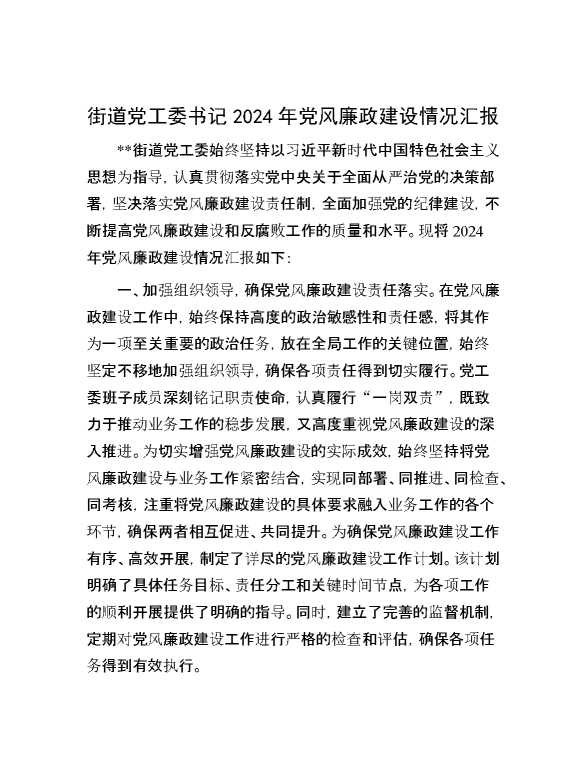 街道党工委书记2024年党风廉政建设情况汇报 2024-06-03 Word模板 85 购买前,请一定要先点击这里看看,欢迎持续关注,精彩模板每天推送 预览结束,本文件为word文档,一共5页,共2405字,请购买后,下载后查看 购买前,请一定要先点击这里看看,欢迎持续关注,精彩模板每天推送 资源下载下载价格29 RMBVIP免费升级VIP点击检测网盘有效后购买有任何充值和下载问题请加微信:xuexixuexi66 0 总结汇报