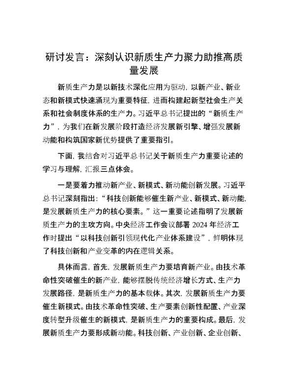 研讨发言:深刻认识新质生产力 聚力助推高质量发展 2024-06-03 Word模板 89 购买前,请一定要先点击这里看看,欢迎持续关注,精彩模板每天推送 预览结束,本文件为word文档,一共4页,共1577字,请购买后,下载后查看 购买前,请一定要先点击这里看看,欢迎持续关注,精彩模板每天推送 资源下载下载价格29 RMBVIP免费升级VIP点击检测网盘有效后购买有任何充值和下载问题请加微信:xuexixuexi66 0 演讲发言
