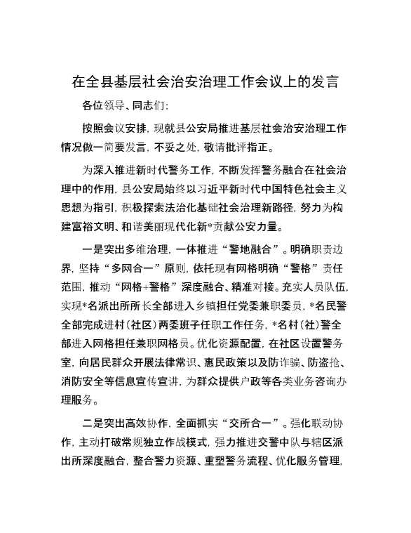 在全县基层社会治安治理工作会议上的发言 2024-06-03 Word模板 93 购买前,请一定要先点击这里看看,欢迎持续关注,精彩模板每天推送 预览结束,本文件为word文档,一共2页,共913字,请购买后,下载后查看 购买前,请一定要先点击这里看看,欢迎持续关注,精彩模板每天推送 资源下载下载价格29 RMBVIP免费升级VIP点击检测网盘有效后购买有任何充值和下载问题请加微信:xuexixuexi66 0 演讲发言