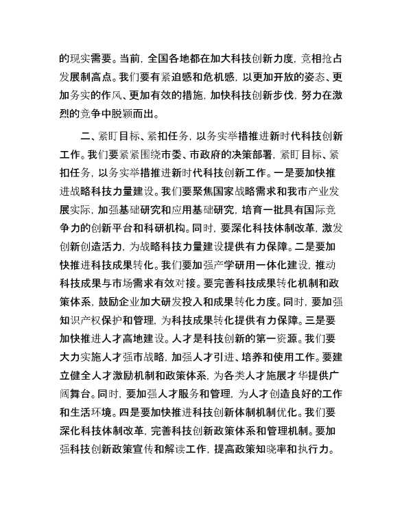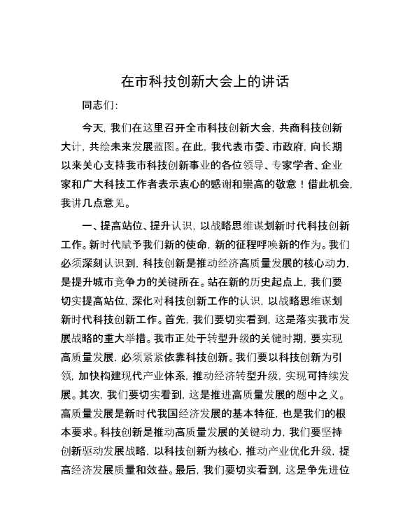 在市科技创新大会上的讲话 2024-06-03 Word模板 90 购买前,请一定要先点击这里看看,欢迎持续关注,精彩模板每天推送 预览结束,本文件为word文档,一共4页,共1590字,请购买后,下载后查看 购买前,请一定要先点击这里看看,欢迎持续关注,精彩模板每天推送 资源下载下载价格29 RMBVIP免费升级VIP点击检测网盘有效后购买有任何充值和下载问题请加微信:xuexixuexi66 0 演讲发言