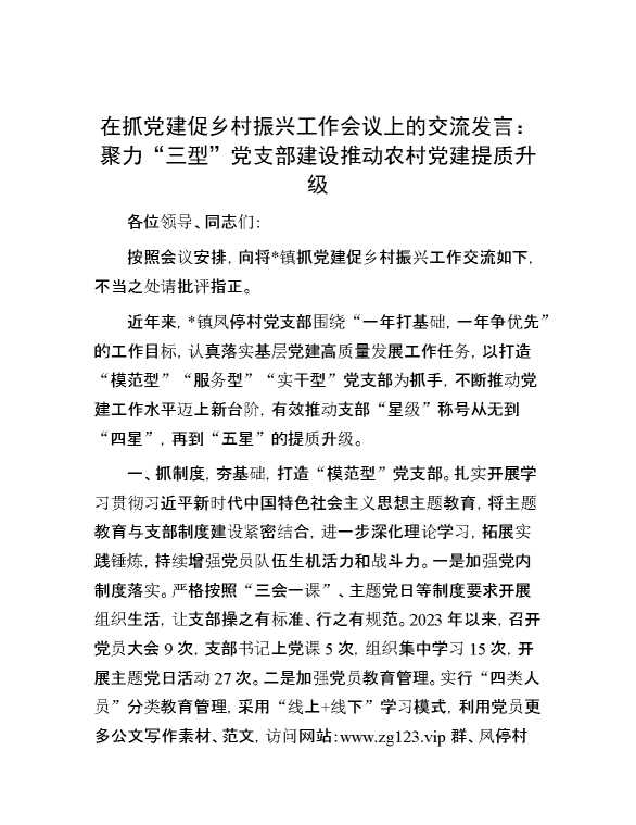 在抓党建促乡村振兴工作会议上的交流发言:聚力“三型”党支部建设推动农村党建提质升级 2024-06-03 Word模板 89 购买前,请一定要先点击这里看看,欢迎持续关注,精彩模板每天推送 预览结束,本文件为word文档,一共3页,共1344字,请购买后,下载后查看 购买前,请一定要先点击这里看看,欢迎持续关注,精彩模板每天推送 资源下载下载价格29 RMBVIP免费升级VIP点击检测网盘有效后购买有任何充值和下载问题请加微信:xuexixuexi66 0 演讲发言