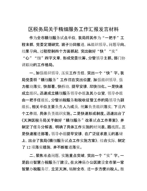 区税务局关于精细服务工作汇报发言材料 2024-06-03 Word模板 97 购买前,请一定要先点击这里看看,欢迎持续关注,精彩模板每天推送 预览结束,本文件为word文档,一共4页,共1765字,请购买后,下载后查看 购买前,请一定要先点击这里看看,欢迎持续关注,精彩模板每天推送 资源下载下载价格29 RMBVIP免费升级VIP点击检测网盘有效后购买有任何充值和下载问题请加微信:xuexixuexi66 0 演讲发言