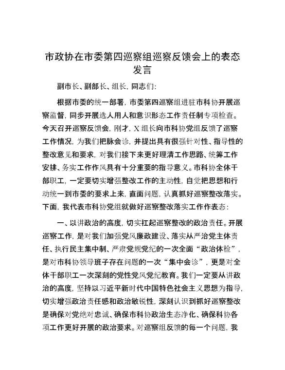 市政协在市委第四巡察组巡察反馈会上的表态发言 2024-06-03 Word模板 93 购买前,请一定要先点击这里看看,欢迎持续关注,精彩模板每天推送 预览结束,本文件为word文档,一共3页,共1361字,请购买后,下载后查看 购买前,请一定要先点击这里看看,欢迎持续关注,精彩模板每天推送 资源下载下载价格29 RMBVIP免费升级VIP点击检测网盘有效后购买有任何充值和下载问题请加微信:xuexixuexi66 0 演讲发言