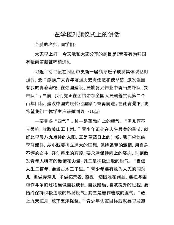 在学校升旗仪式上的讲话 2024-06-10 Word模板 111 购买前,请一定要先点击这里看看,欢迎持续关注,精彩模板每天推送 预览结束,本文件为word文档,一共4页,共1612字,请购买后,下载后查看 购买前,请一定要先点击这里看看,欢迎持续关注,精彩模板每天推送 资源下载下载价格29 RMBVIP免费升级VIP点击检测网盘有效后购买有任何充值和下载问题请加微信:xuexixuexi66 0 演讲发言