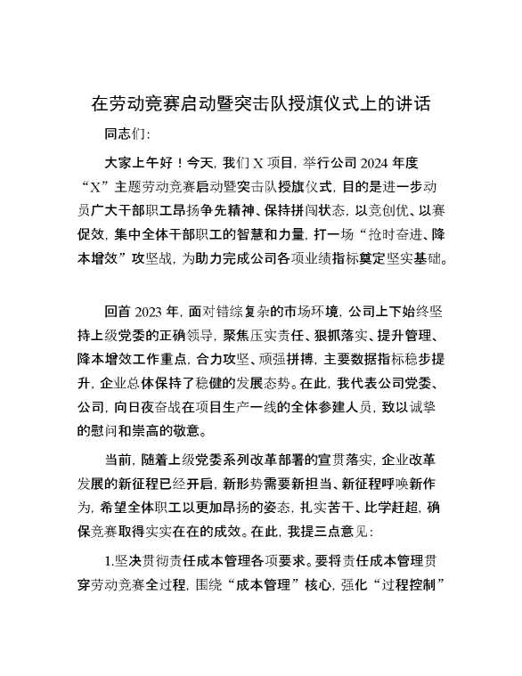 在劳动竞赛启动暨突击队授旗仪式上的讲话 2024-06-10 Word模板 104 购买前,请一定要先点击这里看看,欢迎持续关注,精彩模板每天推送 预览结束,本文件为word文档,一共2页,共890字,请购买后,下载后查看 购买前,请一定要先点击这里看看,欢迎持续关注,精彩模板每天推送 资源下载下载价格29 RMBVIP免费升级VIP点击检测网盘有效后购买有任何充值和下载问题请加微信:xuexixuexi66 0 演讲发言