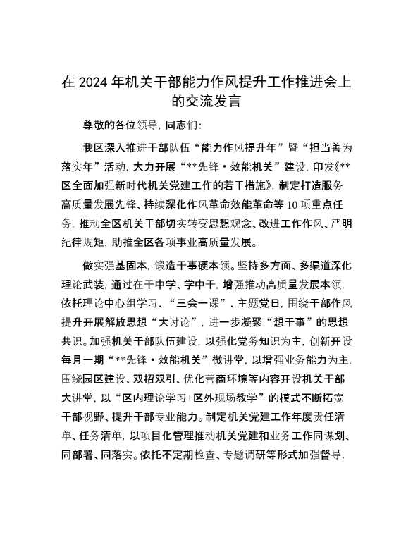 在2024年机关干部能力作风提升工作推进会上的交流发言 2024-06-10 Word模板 90 购买前,请一定要先点击这里看看,欢迎持续关注,精彩模板每天推送 预览结束,本文件为word文档,一共3页,共1087字,请购买后,下载后查看 购买前,请一定要先点击这里看看,欢迎持续关注,精彩模板每天推送 资源下载下载价格29 RMBVIP免费升级VIP点击检测网盘有效后购买有任何充值和下载问题请加微信:xuexixuexi66 0 演讲发言