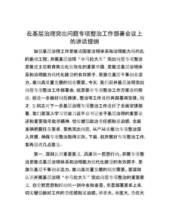 在基层治理突出问题专项整治工作部署会议上的讲话提纲 2024-06-10 Word模板 90 购买前,请一定要先点击这里看看,欢迎持续关注,精彩模板每天推送 预览结束,本文件为word文档,一共5页,共2552字,请购买后,下载后查看 购买前,请一定要先点击这里看看,欢迎持续关注,精彩模板每天推送 资源下载下载价格29 RMBVIP免费升级VIP点击检测网盘有效后购买有任何充值和下载问题请加微信:xuexixuexi66 0 演讲发言