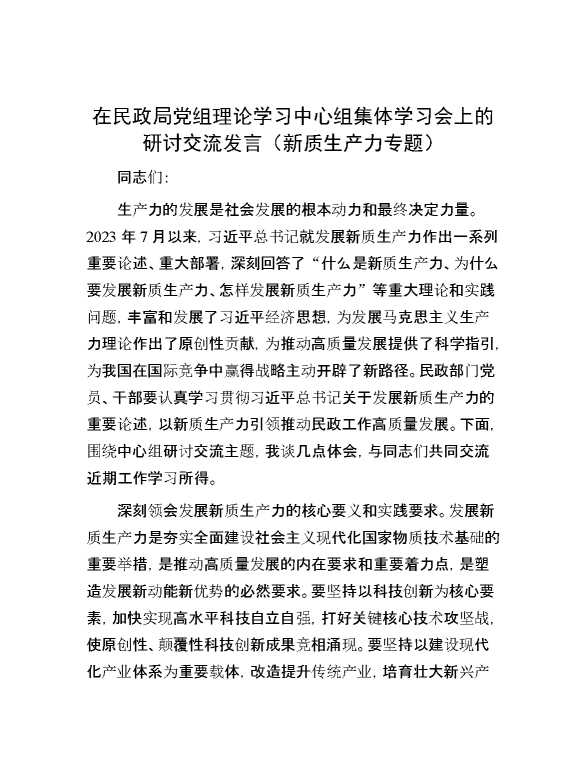 在民政局党组理论学习中心组集体学习会上的研讨交流发言(新质生产力专题) 2024-06-10 Word模板 95 购买前,请一定要先点击这里看看,欢迎持续关注,精彩模板每天推送 预览结束,本文件为word文档,一共3页,共1363字,请购买后,下载后查看 购买前,请一定要先点击这里看看,欢迎持续关注,精彩模板每天推送 资源下载下载价格29 RMBVIP免费升级VIP点击检测网盘有效后购买有任何充值和下载问题请加微信:xuexixuexi66 0 演讲发言