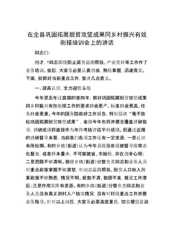 在全县巩固拓展脱贫攻坚成果同乡村振兴有效衔接培训会上的讲话 2024-06-10 Word模板 95 购买前,请一定要先点击这里看看,欢迎持续关注,精彩模板每天推送 预览结束,本文件为word文档,一共5页,共2231字,请购买后,下载后查看 购买前,请一定要先点击这里看看,欢迎持续关注,精彩模板每天推送 资源下载下载价格29 RMBVIP免费升级VIP点击检测网盘有效后购买有任何充值和下载问题请加微信:xuexixuexi66 0 演讲发言