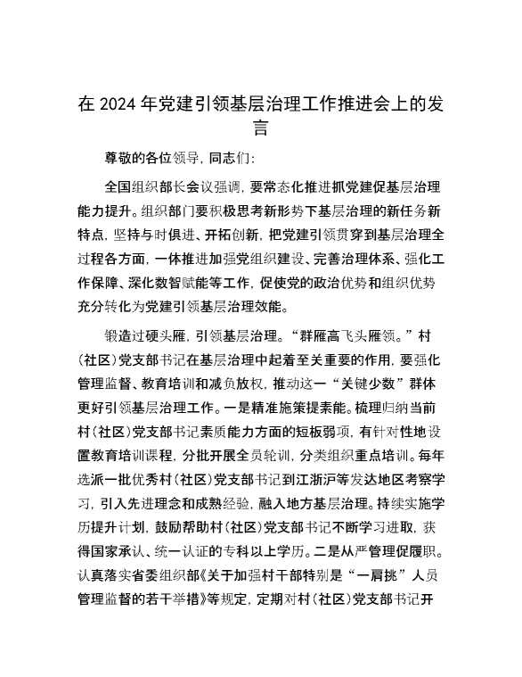 在2024年党建引领基层治理工作推进会上的发言 2024-06-23 Word模板 98 购买前,请一定要先点击这里看看,欢迎持续关注,精彩模板每天推送 预览结束,本文件为word文档,一共5页,共2062字,请购买后,下载后查看 购买前,请一定要先点击这里看看,欢迎持续关注,精彩模板每天推送 资源下载下载价格29 RMBVIP免费升级VIP点击检测网盘有效后购买有任何充值和下载问题请加微信:xuexixuexi66 0 演讲发言