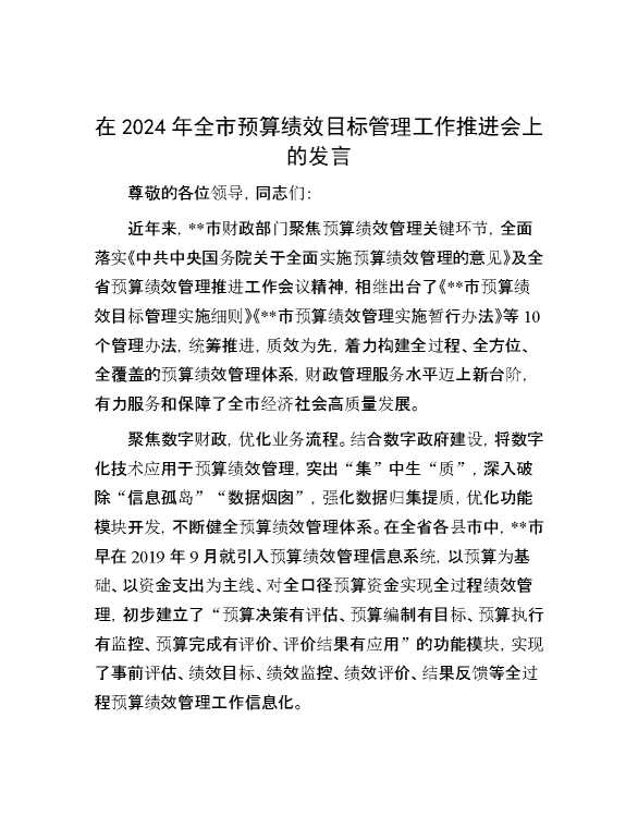 在2024年全市预算绩效目标管理工作推进会上的发言 2024-06-23 Word模板 103 购买前,请一定要先点击这里看看,欢迎持续关注,精彩模板每天推送 预览结束,本文件为word文档,一共3页,共1236字,请购买后,下载后查看 购买前,请一定要先点击这里看看,欢迎持续关注,精彩模板每天推送 资源下载下载价格29 RMBVIP免费升级VIP点击检测网盘有效后购买有任何充值和下载问题请加微信:xuexixuexi66 0 演讲发言