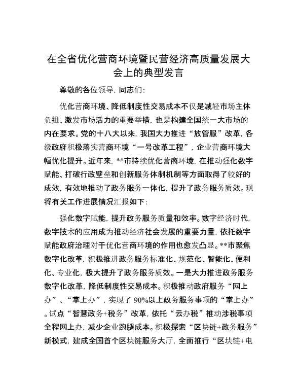 在全省优化营商环境暨民营经济高质量发展大会上的典型发言 2024-06-23 Word模板 105 购买前,请一定要先点击这里看看,欢迎持续关注,精彩模板每天推送 预览结束,本文件为word文档,一共4页,共1788字,请购买后,下载后查看 购买前,请一定要先点击这里看看,欢迎持续关注,精彩模板每天推送 资源下载下载价格29 RMBVIP免费升级VIP点击检测网盘有效后购买有任何充值和下载问题请加微信:xuexixuexi66 0 演讲发言
