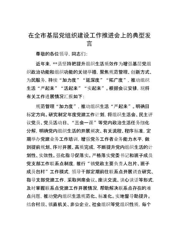 在全市基层党组织建设工作推进会上的典型发言 2024-06-23 Word模板 102 购买前,请一定要先点击这里看看,欢迎持续关注,精彩模板每天推送 预览结束,本文件为word文档,一共3页,共1341字,请购买后,下载后查看 购买前,请一定要先点击这里看看,欢迎持续关注,精彩模板每天推送 资源下载下载价格29 RMBVIP免费升级VIP点击检测网盘有效后购买有任何充值和下载问题请加微信:xuexixuexi66 0 演讲发言