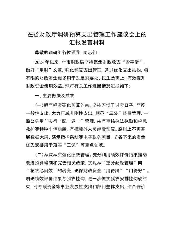 在省财政厅调研预算支出管理工作座谈会上的汇报发言材料 2024-06-23 Word模板 97 购买前,请一定要先点击这里看看,欢迎持续关注,精彩模板每天推送 预览结束,本文件为word文档,一共4页,共1502字,请购买后,下载后查看 购买前,请一定要先点击这里看看,欢迎持续关注,精彩模板每天推送 资源下载下载价格29 RMBVIP免费升级VIP点击检测网盘有效后购买有任何充值和下载问题请加微信:xuexixuexi66 0 演讲发言