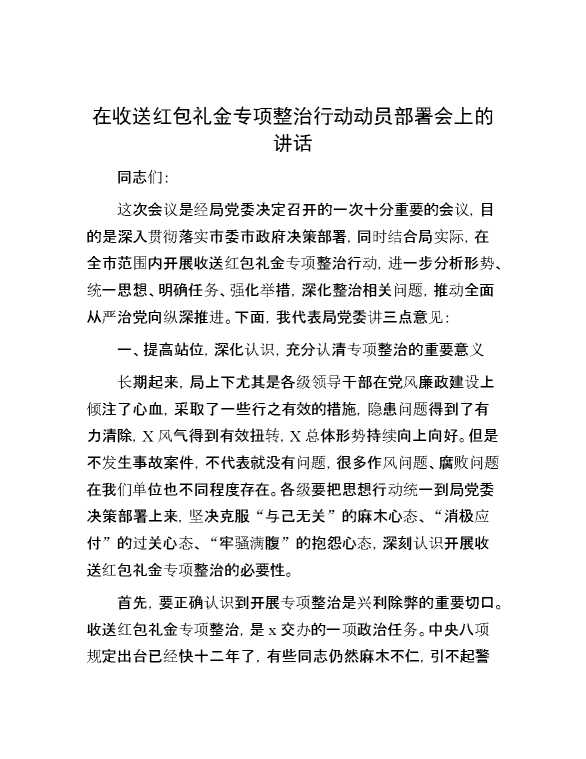 在收送红包礼金专项整治行动动员部署会上的讲话 2024-06-23 Word模板 103 购买前,请一定要先点击这里看看,欢迎持续关注,精彩模板每天推送 预览结束,本文件为word文档,一共6页,共2637字,请购买后,下载后查看 购买前,请一定要先点击这里看看,欢迎持续关注,精彩模板每天推送 资源下载下载价格29 RMBVIP免费升级VIP点击检测网盘有效后购买有任何充值和下载问题请加微信:xuexixuexi66 0 演讲发言