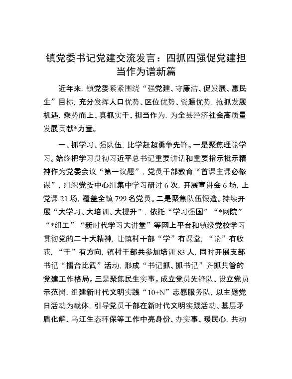 镇党委书记党建交流发言:四抓四强促党建 担当作为谱新篇 2024-06-23 Word模板 103 购买前,请一定要先点击这里看看,欢迎持续关注,精彩模板每天推送 预览结束,本文件为word文档,一共4页,共1694字,请购买后,下载后查看 购买前,请一定要先点击这里看看,欢迎持续关注,精彩模板每天推送 资源下载下载价格29 RMBVIP免费升级VIP点击检测网盘有效后购买有任何充值和下载问题请加微信:xuexixuexi66 0 演讲发言
