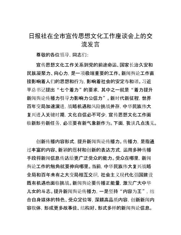 日报社在全市宣传思想文化工作座谈会上的交流发言 2024-06-23 Word模板 111 购买前,请一定要先点击这里看看,欢迎持续关注,精彩模板每天推送 预览结束,本文件为word文档,一共4页,共1927字,请购买后,下载后查看 购买前,请一定要先点击这里看看,欢迎持续关注,精彩模板每天推送 资源下载下载价格29 RMBVIP免费升级VIP点击检测网盘有效后购买有任何充值和下载问题请加微信:xuexixuexi66 0 演讲发言