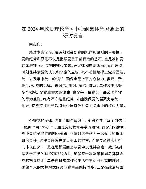 在2024年政协理论学习中心组集体学习会上的研讨发言 2024-06-23 Word模板 112 购买前,请一定要先点击这里看看,欢迎持续关注,精彩模板每天推送 预览结束,本文件为word文档,一共4页,共1747字,请购买后,下载后查看 购买前,请一定要先点击这里看看,欢迎持续关注,精彩模板每天推送 资源下载下载价格29 RMBVIP免费升级VIP点击检测网盘有效后购买有任何充值和下载问题请加微信:xuexixuexi66 0 演讲发言