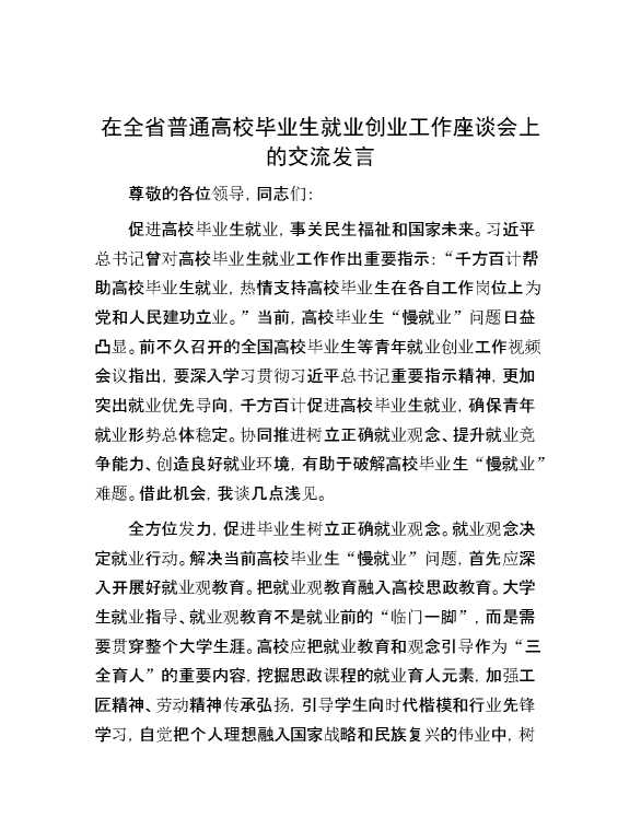 在全省普通高校毕业生就业创业工作座谈会上的交流发言 2024-06-23 Word模板 107 购买前,请一定要先点击这里看看,欢迎持续关注,精彩模板每天推送 预览结束,本文件为word文档,一共5页,共2164字,请购买后,下载后查看 购买前,请一定要先点击这里看看,欢迎持续关注,精彩模板每天推送 资源下载下载价格29 RMBVIP免费升级VIP点击检测网盘有效后购买有任何充值和下载问题请加微信:xuexixuexi66 0 演讲发言