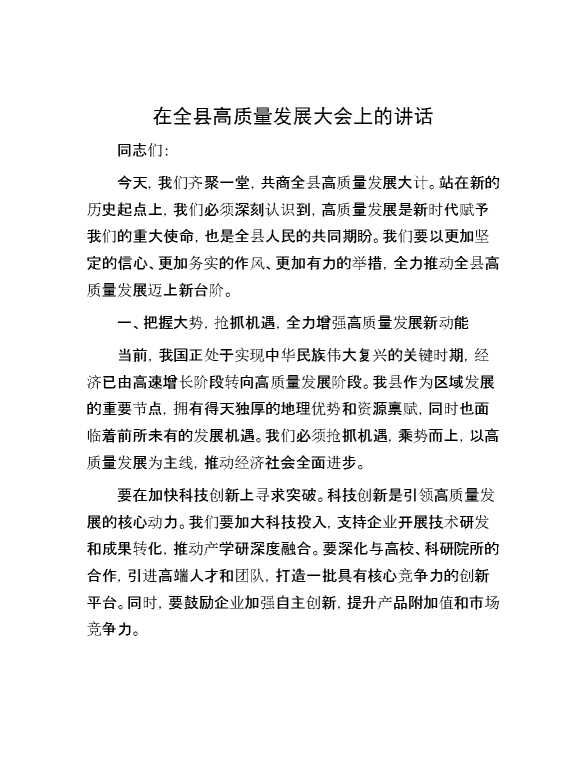 在全县高质量发展大会上的讲话 2024-06-23 Word模板 109 购买前,请一定要先点击这里看看,欢迎持续关注,精彩模板每天推送 预览结束,本文件为word文档,一共5页,共1813字,请购买后,下载后查看 购买前,请一定要先点击这里看看,欢迎持续关注,精彩模板每天推送 资源下载下载价格29 RMBVIP免费升级VIP点击检测网盘有效后购买有任何充值和下载问题请加微信:xuexixuexi66 0 演讲发言