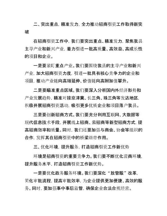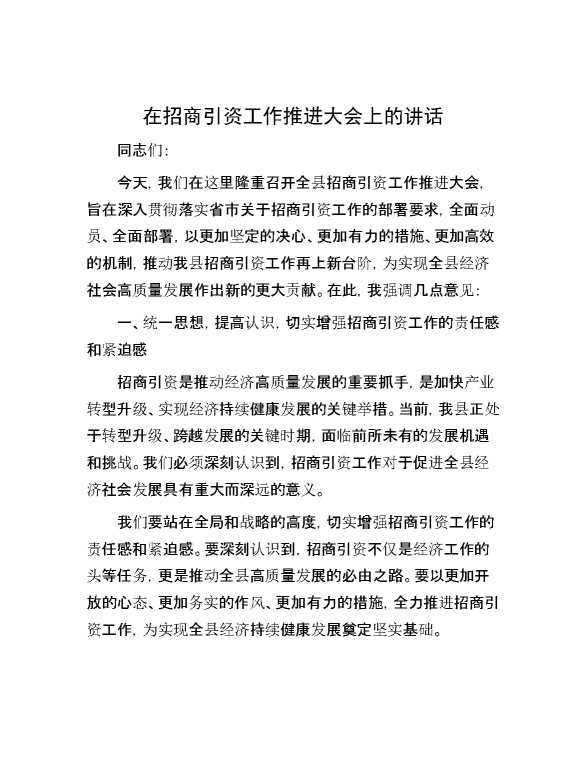 在招商引资工作推进大会上的讲话 2024-06-23 Word模板 123 购买前,请一定要先点击这里看看,欢迎持续关注,精彩模板每天推送 预览结束,本文件为word文档,一共5页,共1734字,请购买后,下载后查看 购买前,请一定要先点击这里看看,欢迎持续关注,精彩模板每天推送 资源下载下载价格29 RMBVIP免费升级VIP点击检测网盘有效后购买有任何充值和下载问题请加微信:xuexixuexi66 0 演讲发言