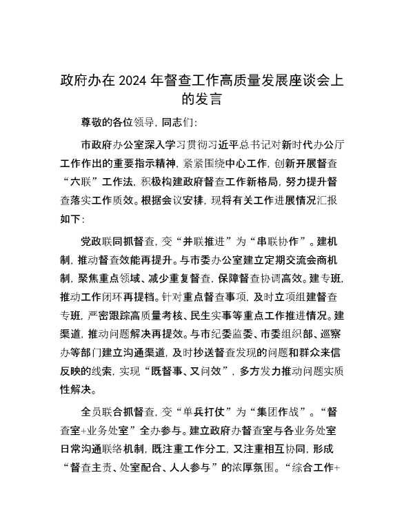 政府办在2024年督查工作高质量发展座谈会上的发言 2024-06-23 Word模板 123 购买前,请一定要先点击这里看看,欢迎持续关注,精彩模板每天推送 预览结束,本文件为word文档,一共4页,共1723字,请购买后,下载后查看 购买前,请一定要先点击这里看看,欢迎持续关注,精彩模板每天推送 资源下载下载价格29 RMBVIP免费升级VIP点击检测网盘有效后购买有任何充值和下载问题请加微信:xuexixuexi66 0 演讲发言