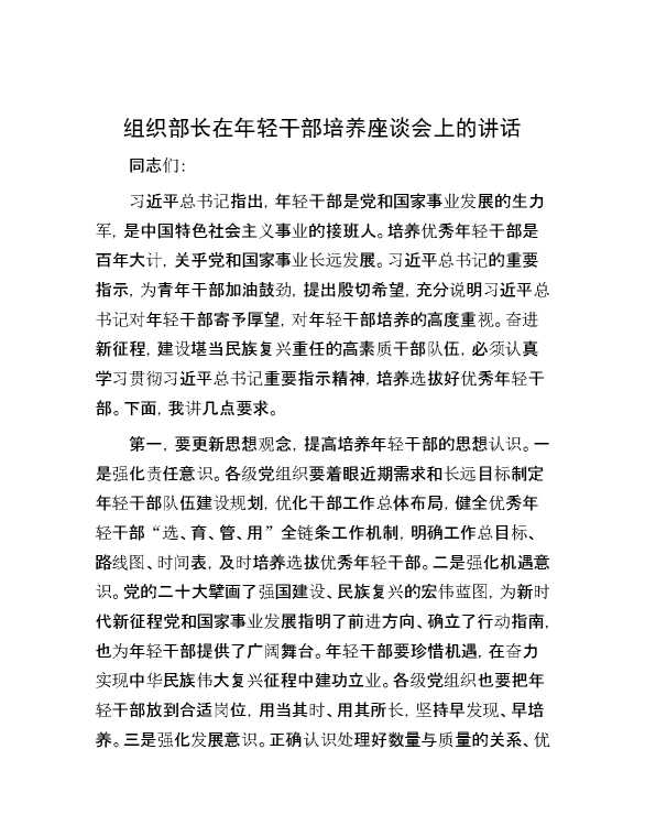 组织部长在年轻干部培养座谈会上的讲话 2024-06-23 Word模板 156 购买前,请一定要先点击这里看看,欢迎持续关注,精彩模板每天推送 预览结束,本文件为word文档,一共5页,共2259字,请购买后,下载后查看 购买前,请一定要先点击这里看看,欢迎持续关注,精彩模板每天推送 资源下载下载价格29 RMBVIP免费升级VIP点击检测网盘有效后购买有任何充值和下载问题请加微信:xuexixuexi66 0 演讲发言