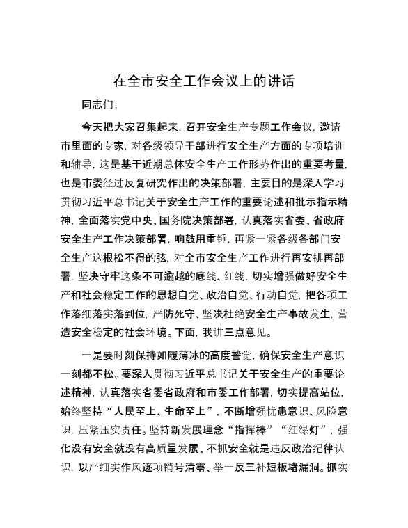 在全市安全工作会议上的讲话 2024-06-26 Word模板 87 购买前,请一定要先点击这里看看,欢迎持续关注,精彩模板每天推送 预览结束,本文件为word文档,一共3页,共1325字,请购买后,下载后查看 购买前,请一定要先点击这里看看,欢迎持续关注,精彩模板每天推送 资源下载下载价格29 RMBVIP免费升级VIP点击检测网盘有效后购买有任何充值和下载问题请加微信:xuexixuexi66 0 演讲发言
