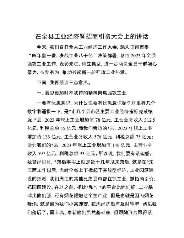 在全县工业经济暨招商引资大会上的讲话 2024-06-26 Word模板 88 购买前,请一定要先点击这里看看,欢迎持续关注,精彩模板每天推送 预览结束,本文件为word文档,一共9页,共4232字,请购买后,下载后查看 购买前,请一定要先点击这里看看,欢迎持续关注,精彩模板每天推送 资源下载下载价格29 RMBVIP免费升级VIP点击检测网盘有效后购买有任何充值和下载问题请加微信:xuexixuexi66 0 演讲发言