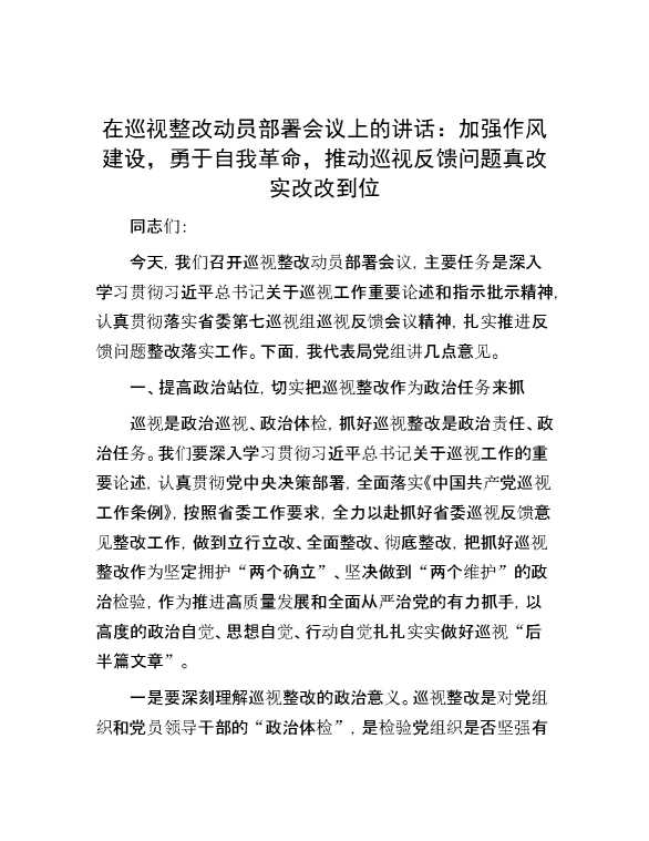 在巡视整改动员部署会议上的讲话:加强作风建设,勇于自我革命,推动巡视反馈问题真改实改改到位 2024-06-26 Word模板 85 购买前,请一定要先点击这里看看,欢迎持续关注,精彩模板每天推送 预览结束,本文件为word文档,一共5页,共1938字,请购买后,下载后查看 购买前,请一定要先点击这里看看,欢迎持续关注,精彩模板每天推送 资源下载下载价格29 RMBVIP免费升级VIP点击检测网盘有效后购买有任何充值和下载问题请加微信:xuexixuexi66 0 演讲发言