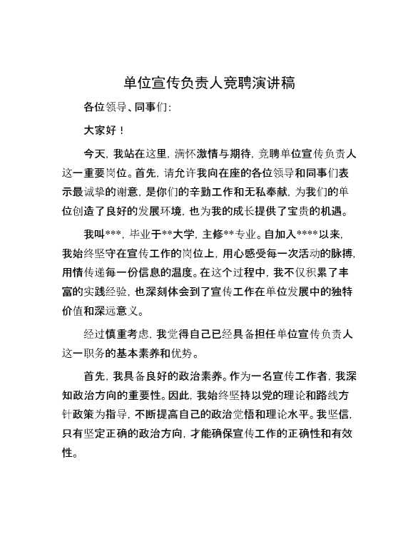 单位宣传负责人竞聘演讲稿 2024-06-26 Word模板 82 购买前,请一定要先点击这里看看,欢迎持续关注,精彩模板每天推送 预览结束,本文件为word文档,一共4页,共1351字,请购买后,下载后查看 购买前,请一定要先点击这里看看,欢迎持续关注,精彩模板每天推送 资源下载下载价格29 RMBVIP免费升级VIP点击检测网盘有效后购买有任何充值和下载问题请加微信:xuexixuexi66 0 演讲发言