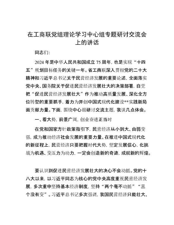 在工商联党组理论学习中心组专题研讨交流会上的讲话 2024-06-26 Word模板 88 购买前,请一定要先点击这里看看,欢迎持续关注,精彩模板每天推送 预览结束,本文件为word文档,一共7页,共3448字,请购买后,下载后查看 购买前,请一定要先点击这里看看,欢迎持续关注,精彩模板每天推送 资源下载下载价格29 RMBVIP免费升级VIP点击检测网盘有效后购买有任何充值和下载问题请加微信:xuexixuexi66 0 演讲发言
