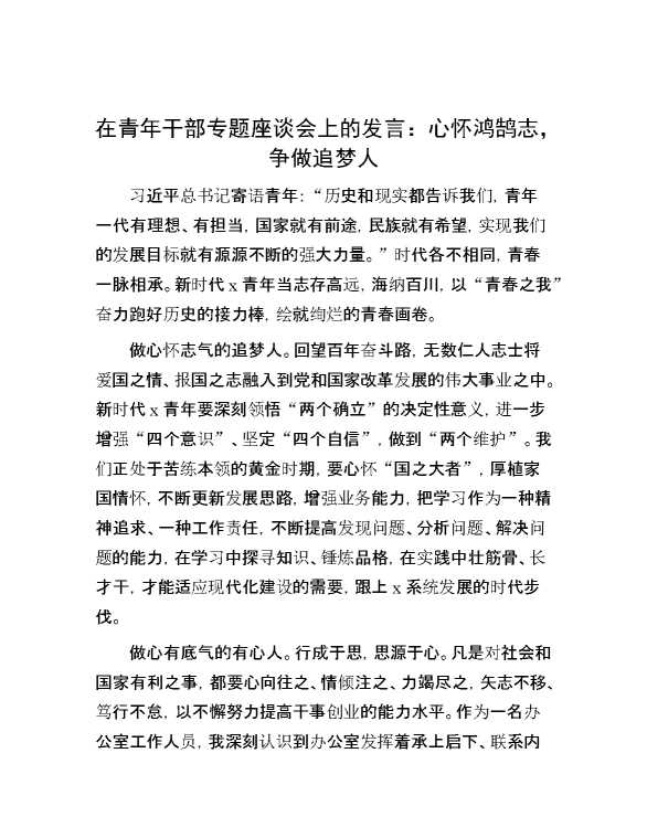 在青年干部专题座谈会上的发言:心怀鸿鹄志,争做追梦人 2024-06-26 Word模板 106 购买前,请一定要先点击这里看看,欢迎持续关注,精彩模板每天推送 预览结束,本文件为word文档,一共3页,共990字,请购买后,下载后查看 购买前,请一定要先点击这里看看,欢迎持续关注,精彩模板每天推送 资源下载下载价格29 RMBVIP免费升级VIP点击检测网盘有效后购买有任何充值和下载问题请加微信:xuexixuexi66 0 演讲发言