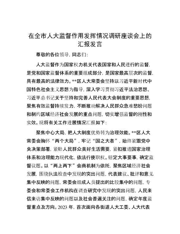 在全市人大监督作用发挥情况调研座谈会上的汇报发言 2024-06-26 Word模板 110 购买前,请一定要先点击这里看看,欢迎持续关注,精彩模板每天推送 预览结束,本文件为word文档,一共4页,共2053字,请购买后,下载后查看 购买前,请一定要先点击这里看看,欢迎持续关注,精彩模板每天推送 资源下载下载价格29 RMBVIP免费升级VIP点击检测网盘有效后购买有任何充值和下载问题请加微信:xuexixuexi66 0 演讲发言