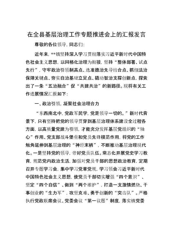 在全县基层治理工作专题推进会上的汇报发言 2024-06-26 Word模板 106 购买前,请一定要先点击这里看看,欢迎持续关注,精彩模板每天推送 预览结束,本文件为word文档,一共7页,共3255字,请购买后,下载后查看 购买前,请一定要先点击这里看看,欢迎持续关注,精彩模板每天推送 资源下载下载价格29 RMBVIP免费升级VIP点击检测网盘有效后购买有任何充值和下载问题请加微信:xuexixuexi66 0 演讲发言