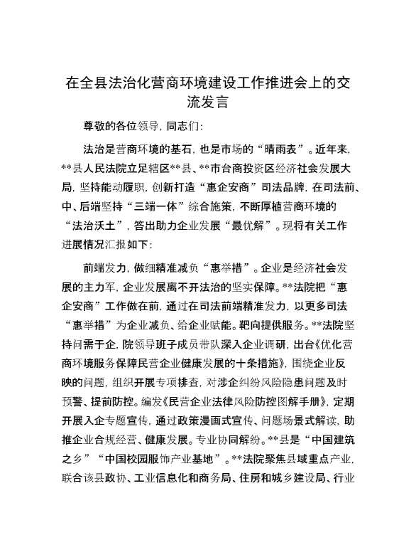 在全县法治化营商环境建设工作推进会上的交流发言 2024-06-26 Word模板 106 购买前,请一定要先点击这里看看,欢迎持续关注,精彩模板每天推送 预览结束,本文件为word文档,一共5页,共2024字,请购买后,下载后查看 购买前,请一定要先点击这里看看,欢迎持续关注,精彩模板每天推送 资源下载下载价格29 RMBVIP免费升级VIP点击检测网盘有效后购买有任何充值和下载问题请加微信:xuexixuexi66 0 演讲发言