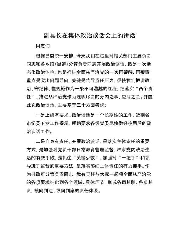 副县长在集体政治谈话会上的讲话 2024-06-26 Word模板 140 购买前,请一定要先点击这里看看,欢迎持续关注,精彩模板每天推送 预览结束,本文件为word文档,一共9页,共4228字,请购买后,下载后查看 购买前,请一定要先点击这里看看,欢迎持续关注,精彩模板每天推送 资源下载下载价格29 RMBVIP免费升级VIP点击检测网盘有效后购买有任何充值和下载问题请加微信:xuexixuexi66 0 演讲发言