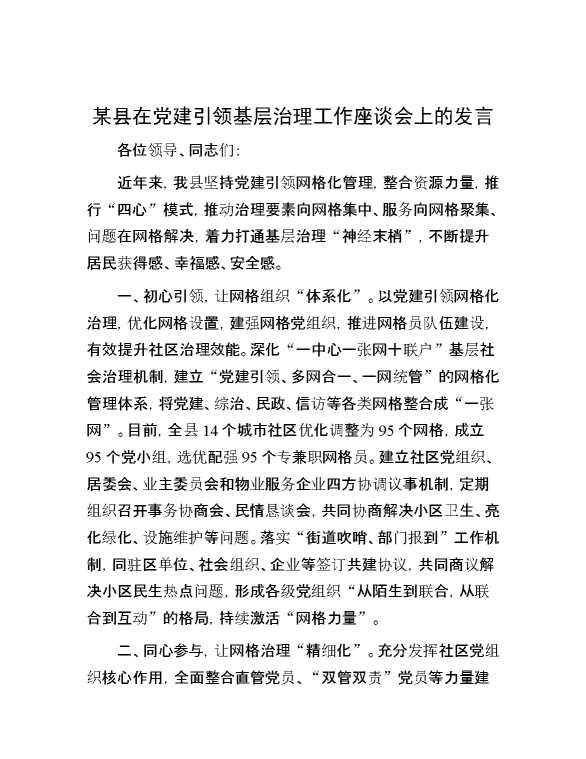 某县在党建引领基层治理工作座谈会上的发言 2024-06-26 Word模板 109 购买前,请一定要先点击这里看看,欢迎持续关注,精彩模板每天推送 预览结束,本文件为word文档,一共3页,共1326字,请购买后,下载后查看 购买前,请一定要先点击这里看看,欢迎持续关注,精彩模板每天推送 资源下载下载价格29 RMBVIP免费升级VIP点击检测网盘有效后购买有任何充值和下载问题请加微信:xuexixuexi66 0 演讲发言