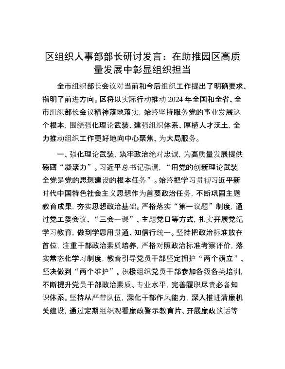 区组织人事部部长研讨发言:在助推园区高质量发展中彰显组织担当 2024-06-26 Word模板 108 购买前,请一定要先点击这里看看,欢迎持续关注,精彩模板每天推送 预览结束,本文件为word文档,一共3页,共1353字,请购买后,下载后查看 购买前,请一定要先点击这里看看,欢迎持续关注,精彩模板每天推送 资源下载下载价格29 RMBVIP免费升级VIP点击检测网盘有效后购买有任何充值和下载问题请加微信:xuexixuexi66 0 演讲发言