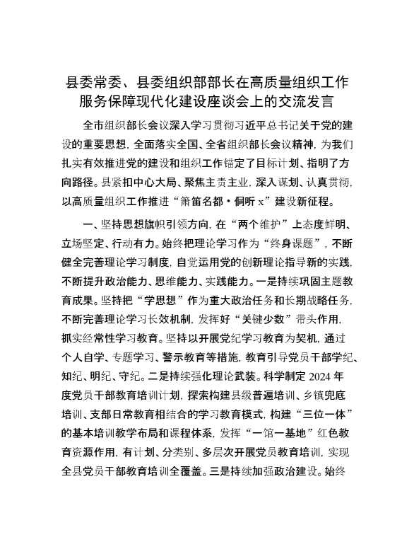 县委常委、县委组织部部长在高质量组织工作服务保障现代化建设座谈会上的交流发言 2024-06-26 Word模板 131 购买前,请一定要先点击这里看看,欢迎持续关注,精彩模板每天推送 预览结束,本文件为word文档,一共5页,共2275字,请购买后,下载后查看 购买前,请一定要先点击这里看看,欢迎持续关注,精彩模板每天推送 资源下载下载价格29 RMBVIP免费升级VIP点击检测网盘有效后购买有任何充值和下载问题请加微信:xuexixuexi66 0 演讲发言