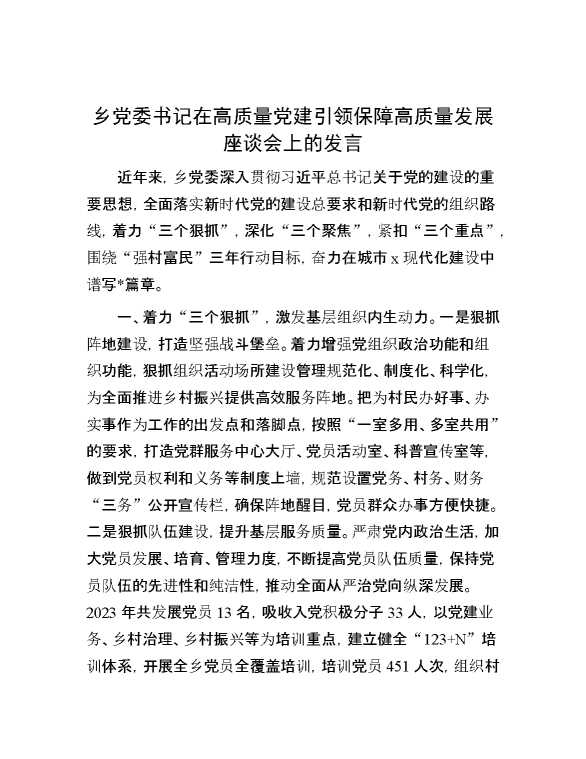 乡党委书记在高质量党建引领保障高质量发展座谈会上的发言 2024-06-26 Word模板 106 购买前,请一定要先点击这里看看,欢迎持续关注,精彩模板每天推送 预览结束,本文件为word文档,一共4页,共1793字,请购买后,下载后查看 购买前,请一定要先点击这里看看,欢迎持续关注,精彩模板每天推送 资源下载下载价格29 RMBVIP免费升级VIP点击检测网盘有效后购买有任何充值和下载问题请加微信:xuexixuexi66 0 演讲发言