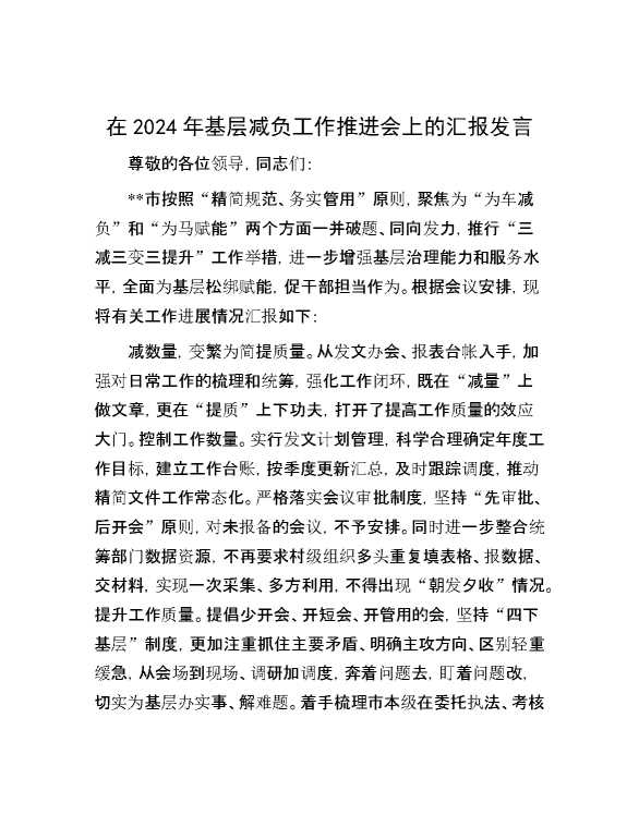 在2024年基层减负工作推进会上的汇报发言 2024-06-26 Word模板 111 购买前,请一定要先点击这里看看,欢迎持续关注,精彩模板每天推送 预览结束,本文件为word文档,一共3页,共1165字,请购买后,下载后查看 购买前,请一定要先点击这里看看,欢迎持续关注,精彩模板每天推送 资源下载下载价格29 RMBVIP免费升级VIP点击检测网盘有效后购买有任何充值和下载问题请加微信:xuexixuexi66 0 演讲发言