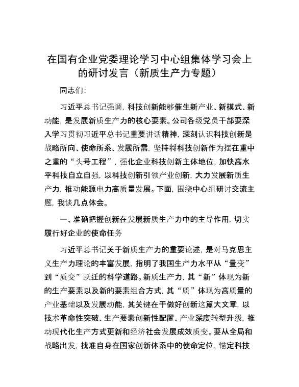 在国有企业党委理论学习中心组集体学习会上的研讨发言(新质生产力专题) 2024-06-26 Word模板 107 购买前,请一定要先点击这里看看,欢迎持续关注,精彩模板每天推送 预览结束,本文件为word文档,一共7页,共2990字,请购买后,下载后查看 购买前,请一定要先点击这里看看,欢迎持续关注,精彩模板每天推送 资源下载下载价格29 RMBVIP免费升级VIP点击检测网盘有效后购买有任何充值和下载问题请加微信:xuexixuexi66 0 演讲发言