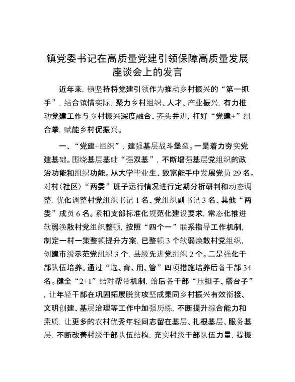 镇党委书记在高质量党建引领保障高质量发展座谈会上的发言 2024-06-26 Word模板 107 购买前,请一定要先点击这里看看,欢迎持续关注,精彩模板每天推送 预览结束,本文件为word文档,一共4页,共1735字,请购买后,下载后查看 购买前,请一定要先点击这里看看,欢迎持续关注,精彩模板每天推送 资源下载下载价格29 RMBVIP免费升级VIP点击检测网盘有效后购买有任何充值和下载问题请加微信:xuexixuexi66 0 演讲发言