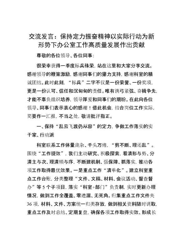 交流发言:保持定力 振奋精神 以实际行动为新形势下办公室工作高质量发展作出贡献 2024-06-26 Word模板 128 购买前,请一定要先点击这里看看,欢迎持续关注,精彩模板每天推送 预览结束,本文件为word文档,一共5页,共2378字,请购买后,下载后查看 购买前,请一定要先点击这里看看,欢迎持续关注,精彩模板每天推送 资源下载下载价格29 RMBVIP免费升级VIP点击检测网盘有效后购买有任何充值和下载问题请加微信:xuexixuexi66 0 演讲发言